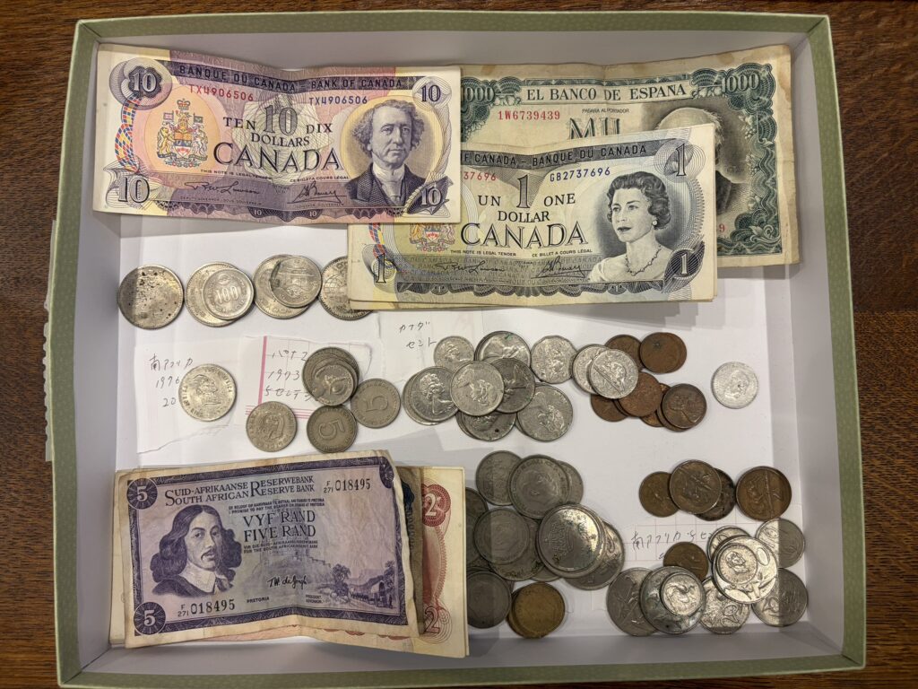 拝見させていただきましたところ、外国硬貨(古いカナダドル紙幣やパナマ、南アフリカの硬貨、紙幣など)や日本の昭和期の記念切手、中国の切手などがございました。